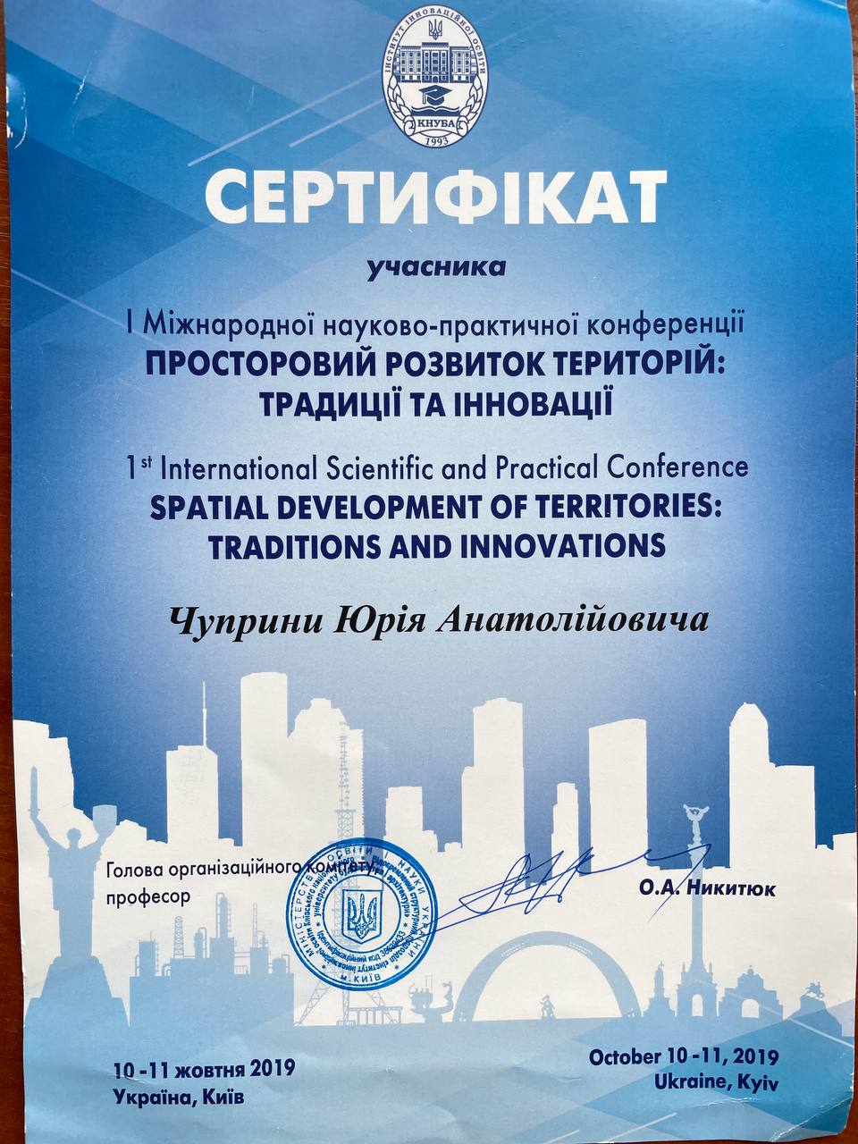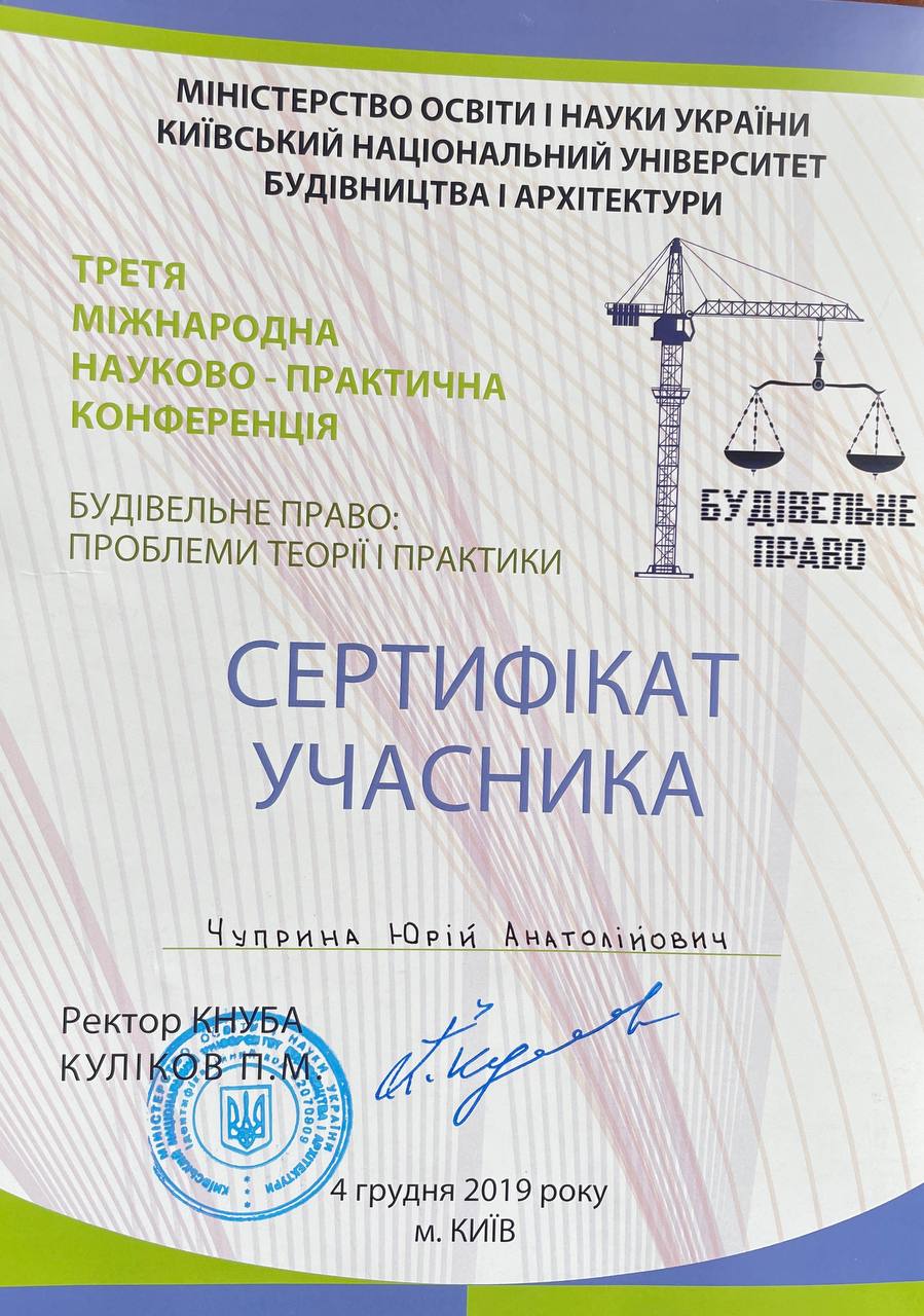 Доктор економічних наук 08.00.03 – «економіка та управління національним господарством», тема: «Державне регулювання організацією територіальних кластерів на основі державно-приватного партнерства», 2019р., ДД№009556 від 26.02.2020 р., МОНУ. Атестат доцента кафедри менеджменту в будівництві від 18.12.2018 р., АД №001551. Атестат професора по кафедрі менеджменту в будівництві від 09.08.2022 р., АП №004208