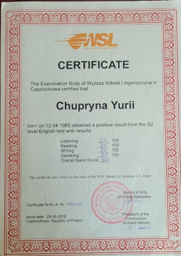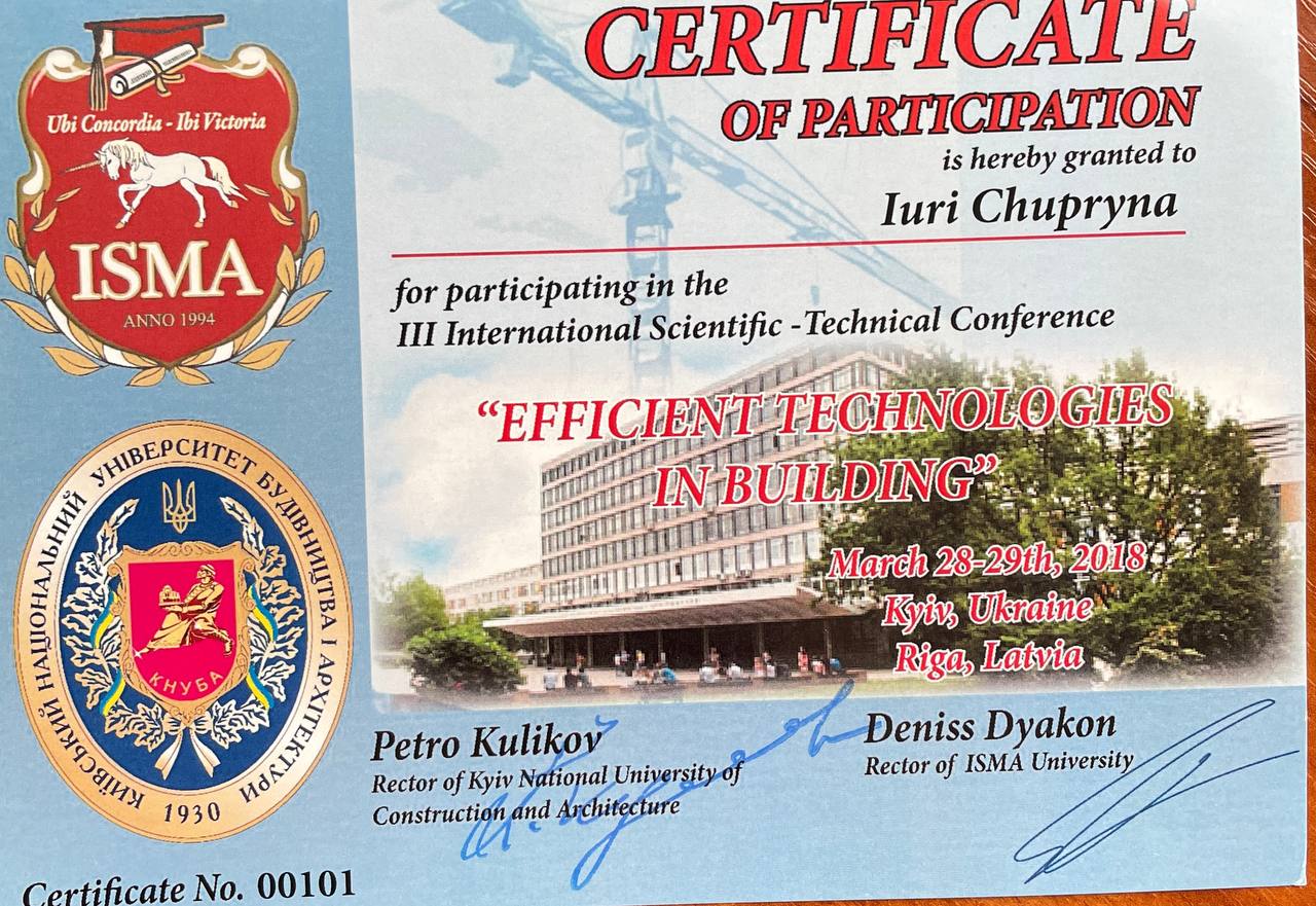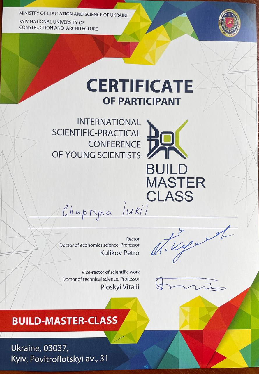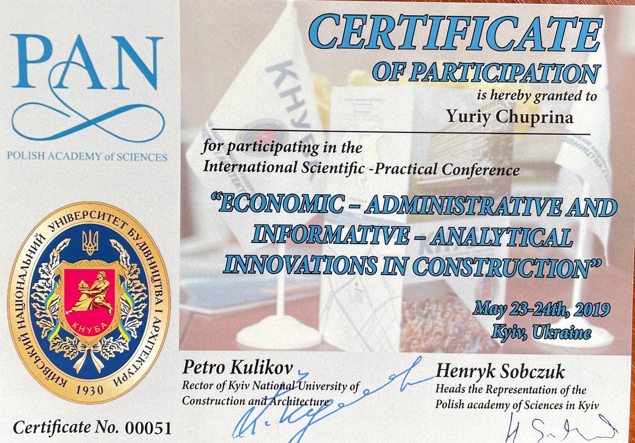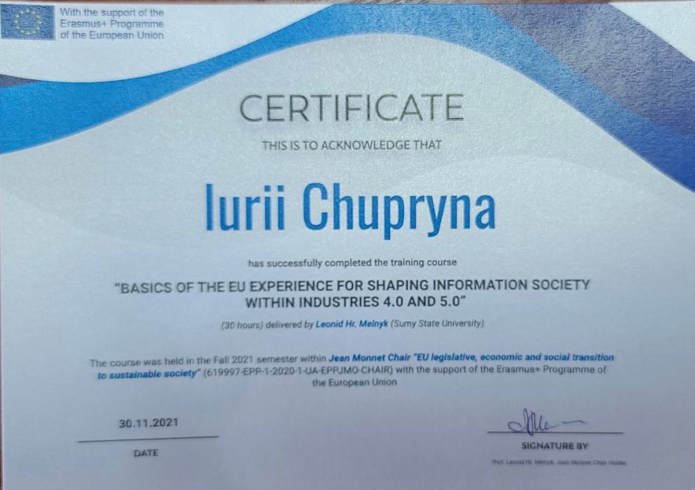 Пройшов міжнародне стажування в Astana IT University, сертифікат про наукове стажування, «Управління підприємствами в умовах цифровізації економіки», 20.09.2021р., 180 год. Наказ КНУБА № 1030/1 від 03.11.2021р