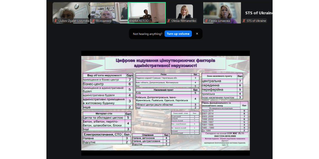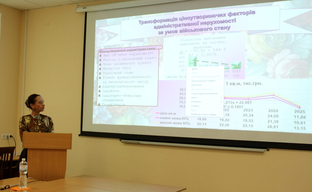 Виступ Лесі Сорокіної, д.е.н., професора кафедри економіки будівництва КНУБА, яка у співавторстві з Анатолієм Гойком і Сергієм Стеценком представила результати масштабного аналітичного дослідження «Трансформація ціноутворюючих чинників адміністративної нерухомості за умов воєнного стану».
