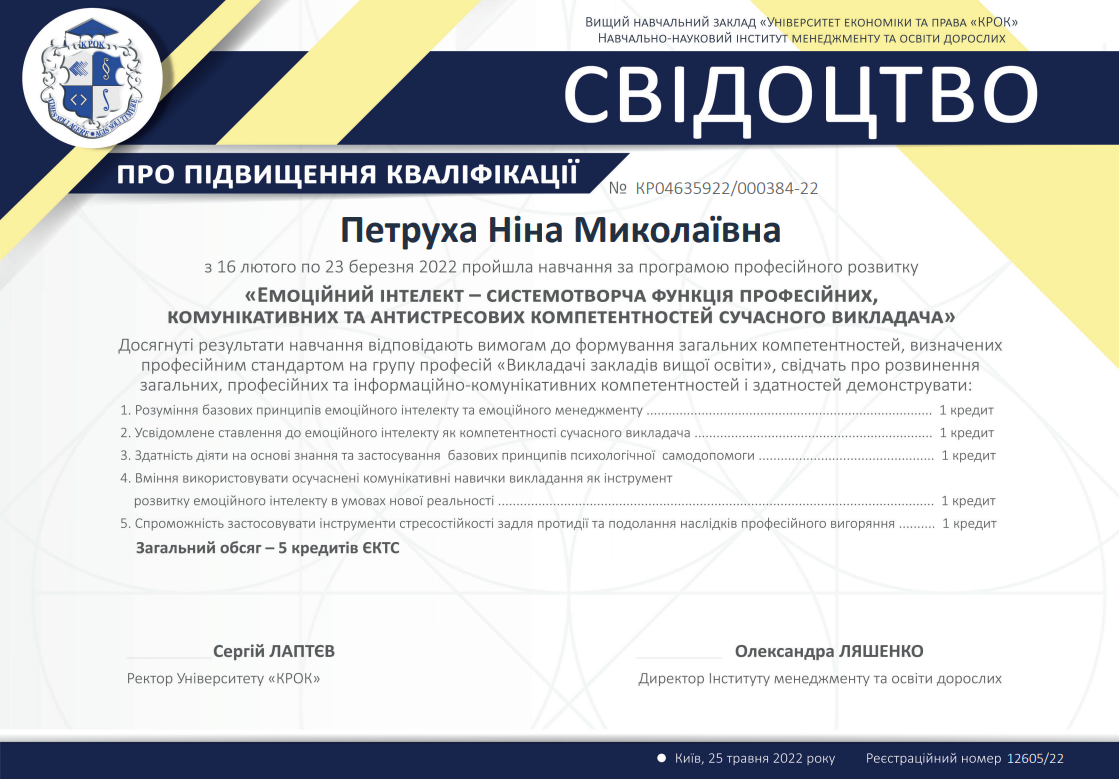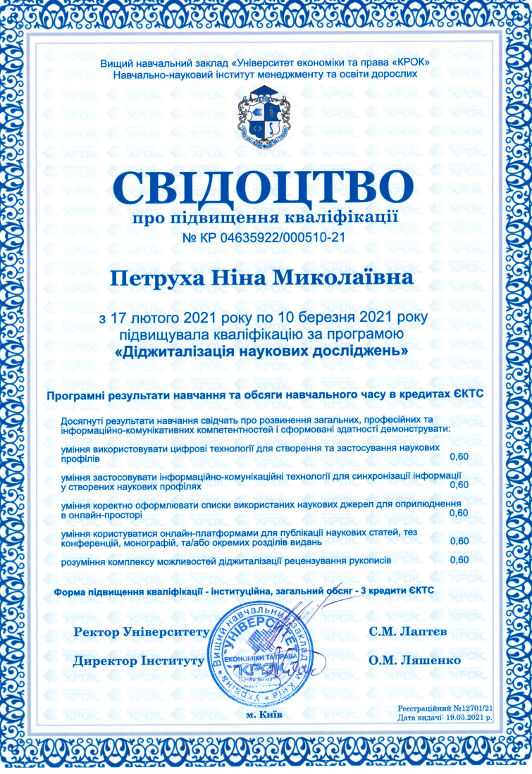 ВНЗ Університет економіки та права «КРОК», свідоцтво про підвищення кваліфікації за програмою «Діджи-талізація наукових досліджень», дата видачі: 19.03.2021 р., № КР 04635922/000510-21, 3 кредита ECTS;