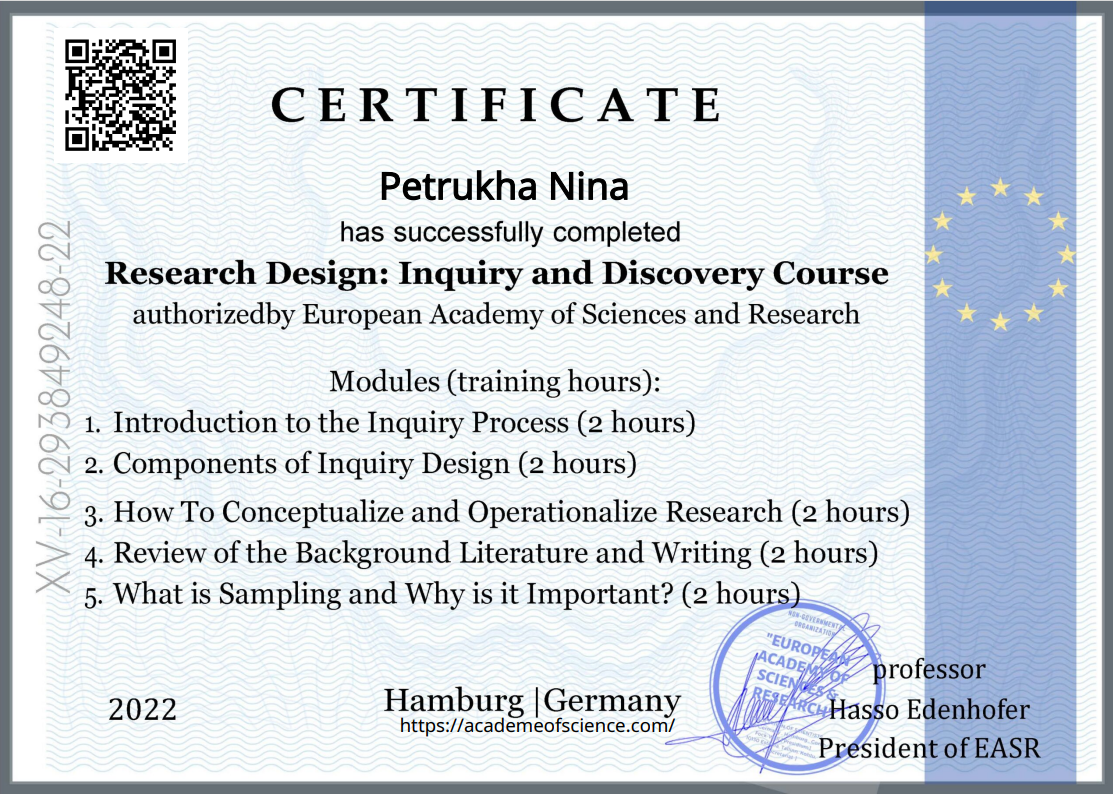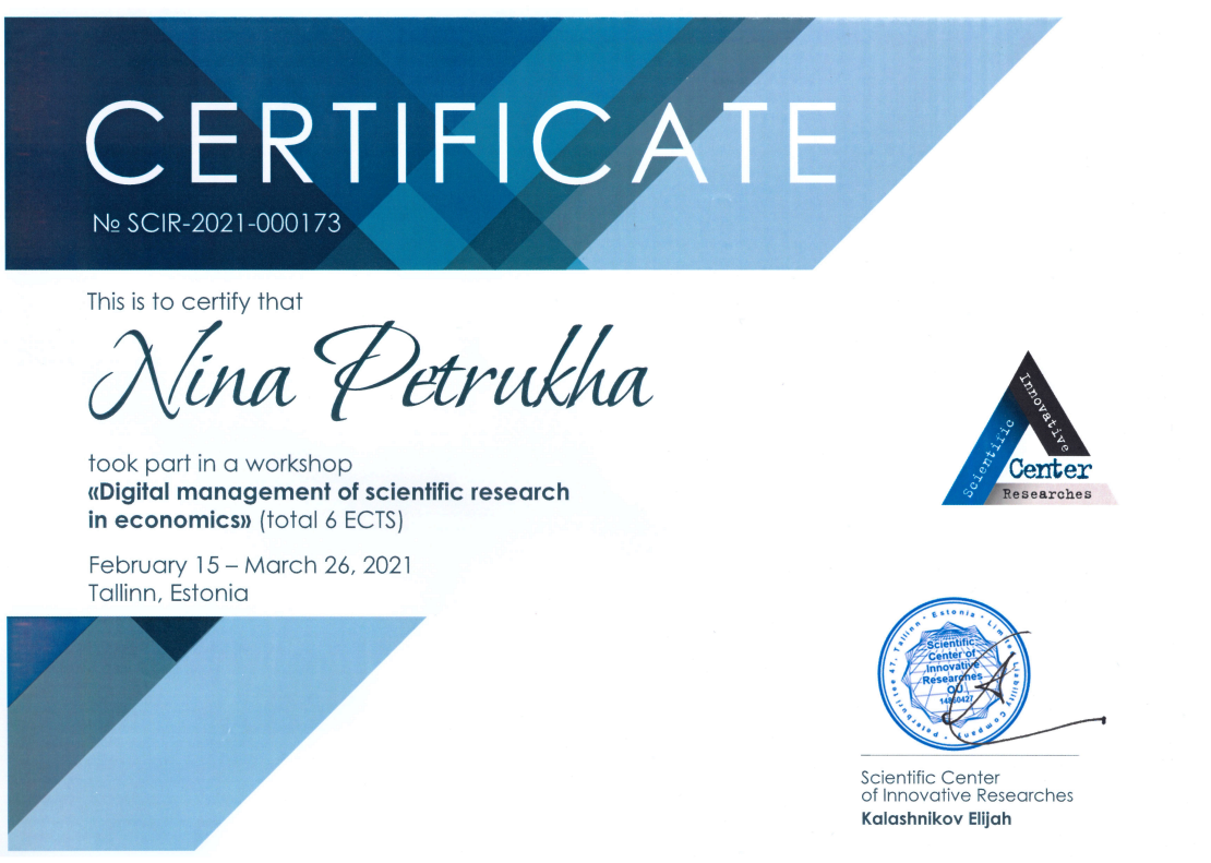 Scientific Center of Innovative Researches, Certificate «Digital management of scientific research in economics», дата видачі: 26.03.2021, № SCIR-2021-000173, 6 кредитів ECTS;