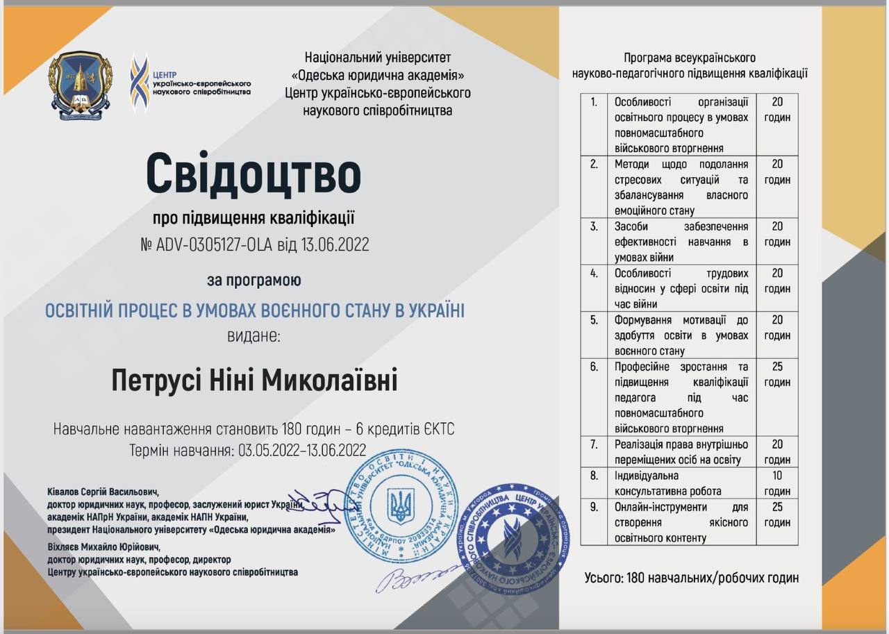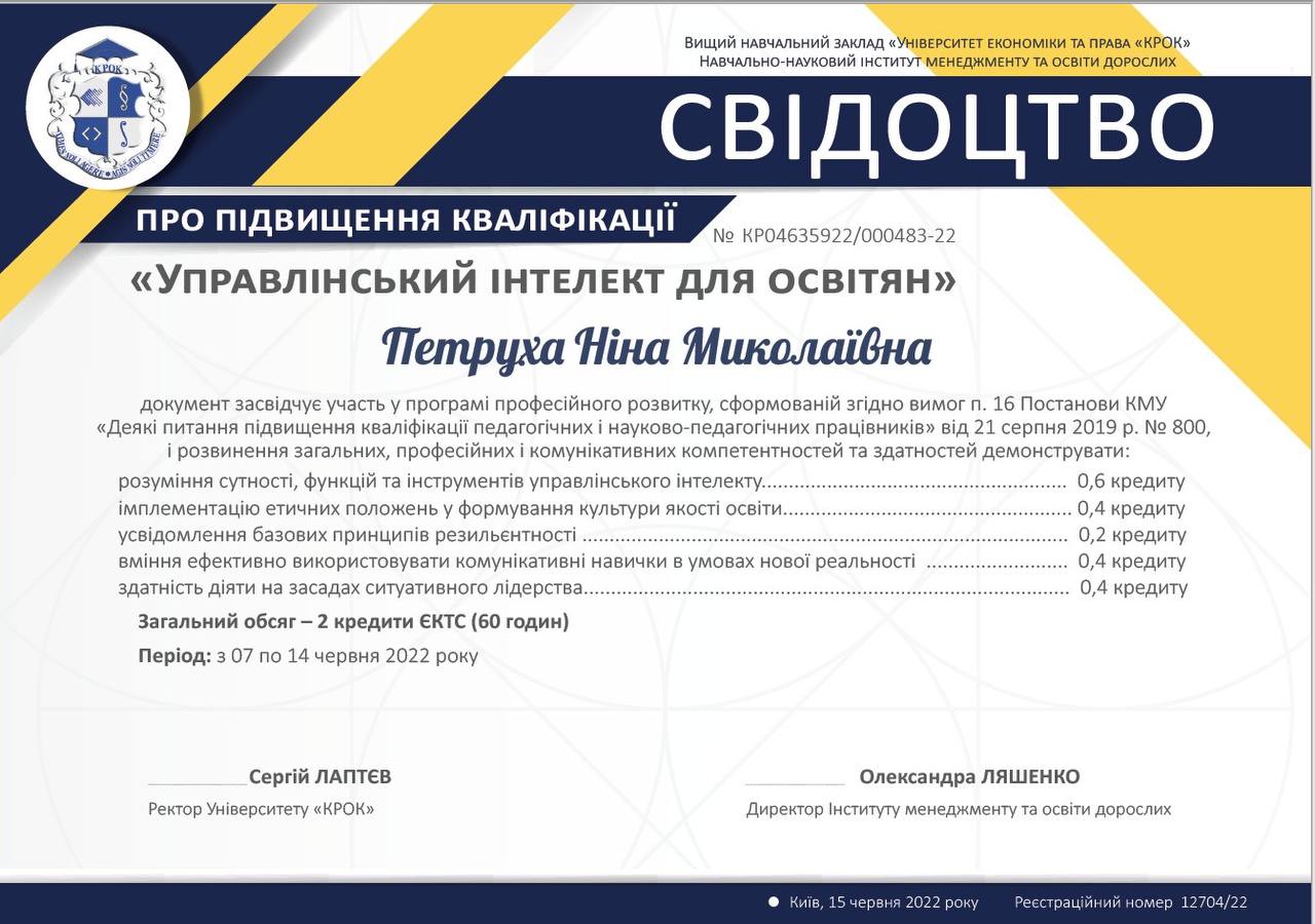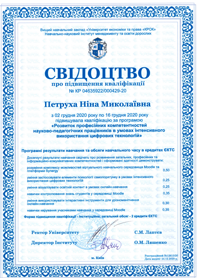 ВНЗ Університет економіки та права «КРОК», свідоцтво про підвищення кваліфікації за програмою «Розвиток професійних компетент-ностей науково-педагогічних працівників в умовах інтенсивного використання цифрових технологій», дата видачі: 24.12.2020 р., № КР 04635922/000429-20, 2 кредита ECTS;