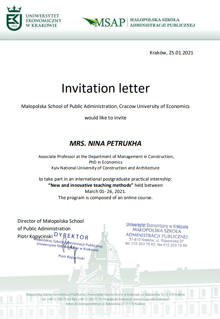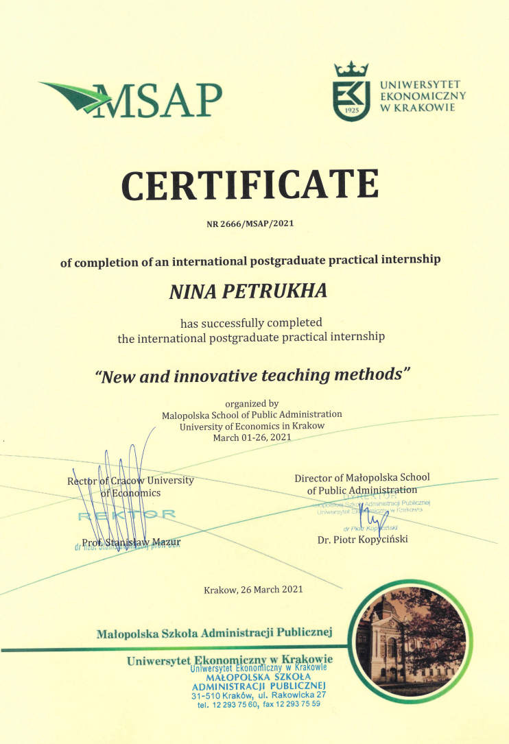 CracowUniversityofEconomic, MalopolskaSchoolofPublicAdministration, Certificate «Newandinnovativeteachingmethods», дата видачі: 26.03.2021 р., № NR 2666/MSAP/2021, 4 кредита ECTS (120 год);