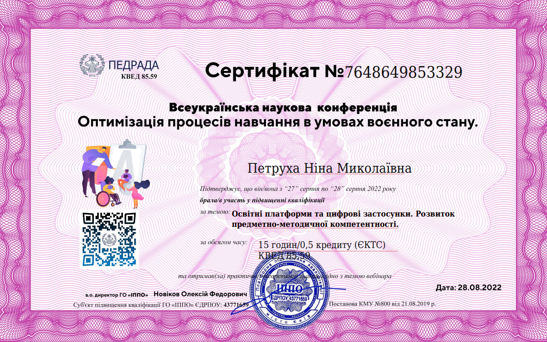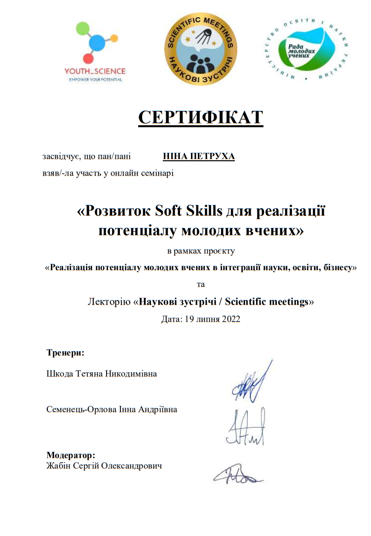 WhyArePlanningandManagementSkillsImportantforResearc; HowDoYouKnowYouHaveBeena GoodResearcherattheEndof aProject», дата видачі: 05.08.2021, № ХІ 12-190293846-19, 0,27кредитуECTS (8 hours);