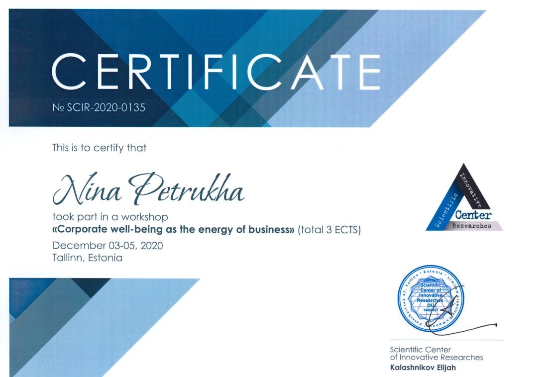 Scientific Center of Innovative Researches, Certificate «Corporate well-being as the energy of business»,