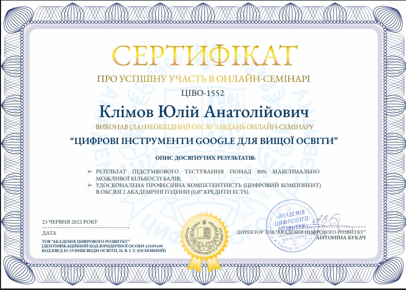 ПІДВИЩЕННЯ КВАЛІФІКАЦІЇ КЛІМОВ Ю.А.